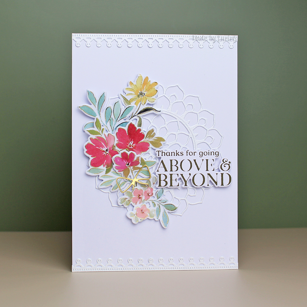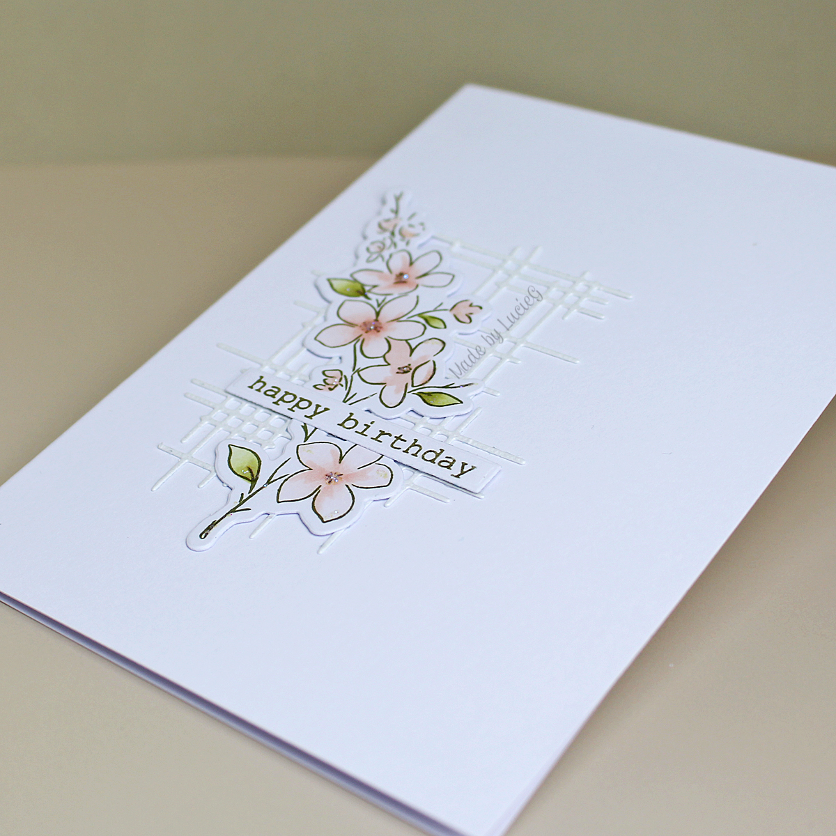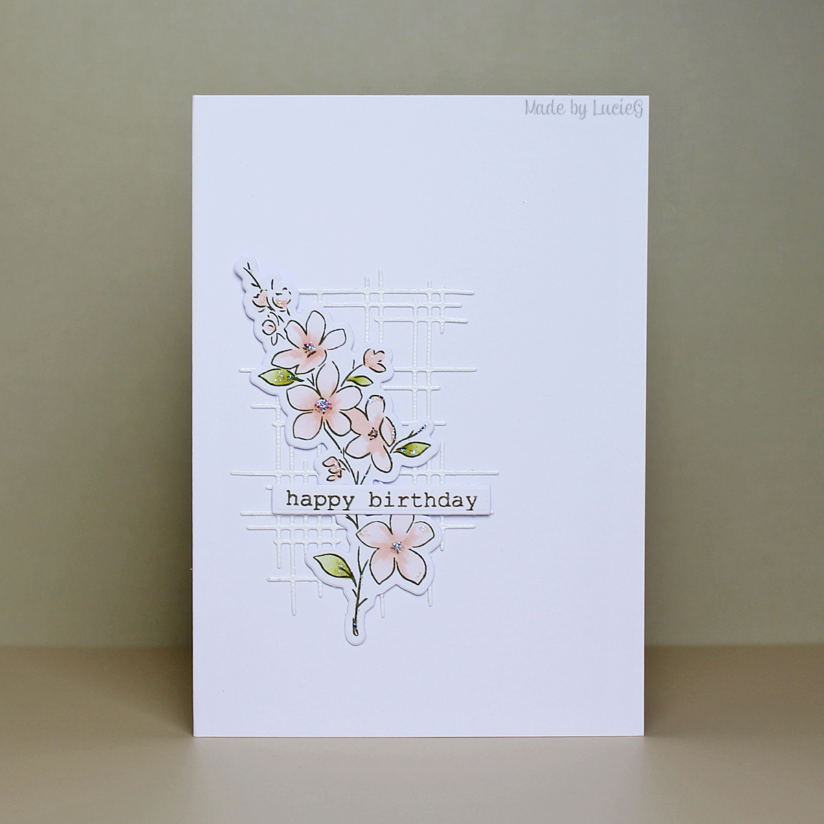 First up is the card I created with the reject card base from my Day 3 card. While making that card, I felt that I had stuck the Altenew Linear Crossroads a little too high for die cuts that I had chosen to use. I didn’t want to waste it – it would be wrong when the whole point of this week is to address my unused piles rather than add to them. So, I chose a branch from the Pinkfresh Sakura product suite and added a sentiment and some stickles for a CAS and importantly Royal Mail-able card for a crafty friend.
