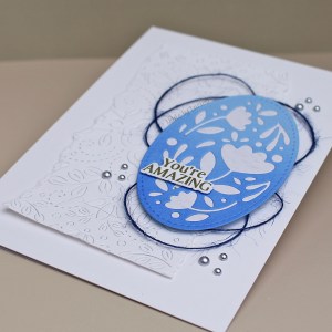 I decided to embrace texture with my final challenge entry so I paired the oval with an piece of torn card that I had cut with the Charming Stitched Florals coverplate die and some navy twine. The sentiment is from the Butterfly Bliss product suite.