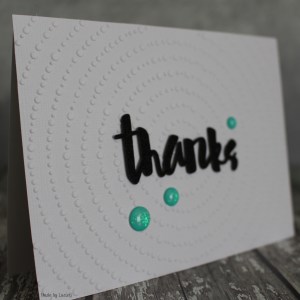 I’m loving the current Simon Says Stamp Flickr challenge – black and white with a splash of colour. Here’s another entry using the Painted Thanks die from Simon Says Stamp plus the gorgeous Grands Cercles embossing folder from Studio Carabelle! I added a couple of Doodlebug enamel dots for the splash of colour.