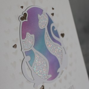 I lightly dusted some regular distress ink die onto the background using a stencil from Simon Says Stamp and then stamped a sentiment from Ellen Hutson. I then added a few die cut glitter hearts to finish it off!