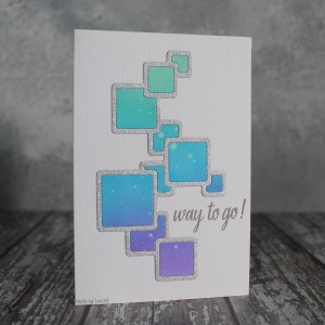 I cut an inked background with a Memory Box die and inlaid the pieces into the frame that I’d cut from glitter paper. I really wanted to add more bling, but I’m hoping to add this to my woefully small supply of male cards, so I just stamped a simple sentiment from Hero Arts to finish it off.