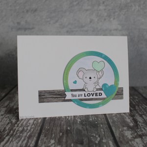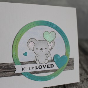 Anyway, for my card, I stamped and coloured the cute koala and then carefully cut just under the image so I could slip a strip of My Mind’s Eye paper underneath – so that it looked like he was sitting on the strip. Anyway, I then added a circle from that I cut from a distress oxide background I made a while back and added a sentiment from the set. I still felt like the card needed ‘something’, so I cut out two hearts to finish it off.