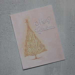 Anyway, after embossing the image, I inked over it with distress inks (regular and oxide) – untraditional colours again… I think that was my subconscious theme for world card making day! Anyway, I lifted some colour from the tree using a paint brush and generously splattered some water across the whole card to create soft snow.