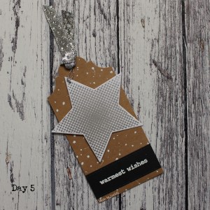I used silver shimmer Delicata ink with the largest star stamp in the Halftone Stars stamp set and paired it with part of a sentiment from the Sketched Evergreen stamp set. This was probably the quickest tag I did (excluding the time it took for me to find my matching star dies, that is!)