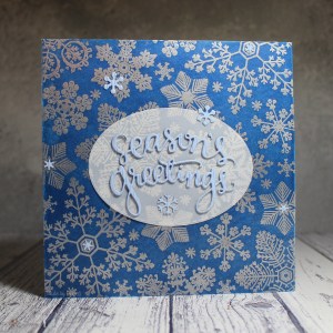 I wanted to add a die cut sentiment from Simon Says Stamp, but it didn’t stand out very well against the background so I added a vellum oval – I love how you can still see those beautiful embossed snowflakes through it! To finish off the card, I added some Lawn Fawn snowflakes.