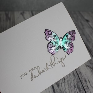 When I saw the theme for this week’s Casology challenge (encouragement), I thought a simply sentiment and butterfly would work well. I stamped a sentiment from a Dina Wakley using Lightning Black Brilliance ink and then adhered the butterfly using some foam pads.