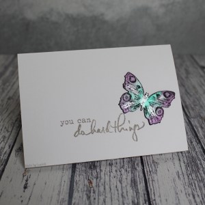 When I saw the theme for this week’s Casology challenge (encouragement), I thought a simply sentiment and butterfly would work well. I stamped a sentiment from a Dina Wakley using Lightning Black Brilliance ink and then adhered the butterfly using some foam pads.
