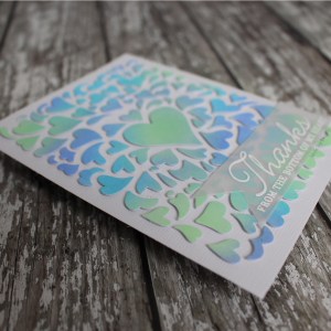 For the first card, I channelled my inner Laura Fadora and used the wonderful ‘Press ‘n Seal’ technique that she demonstrated a few weeks ago. Thanks for the inspiration Laura, I LOVE this technique. It did take AGES to apply foam to the back of the confetti pieces, but it was totally worth it! Once I had stuck all the little die cut images to the base card, I embossed a sentiment (from an older Hero Arts set) on vellum and stuck it onto the card.