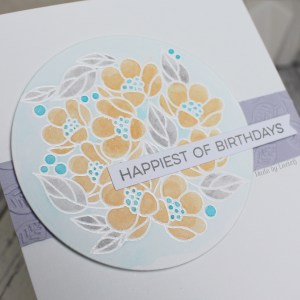 I finally inked up and embossed part of the Simon Says Stamp Centre Cut Flowers stamp and coloured it with my new paints. I dry embossed a strip of grey cardstock and adhered it to my base card before adding the coloured image.