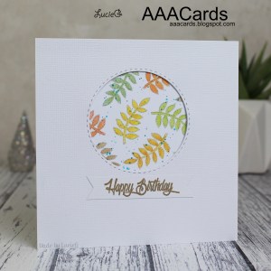 I then cut a circle from a square piece of white card to create a frame to go on top of the leafy background. I knew I wanted to raise the frame a little, but didn’t want to use funky foam. Instead, I created another frame from card and adhered one on top of the other to give my card some very subtle dimension. Finally, I added a Happy Little Stampers sentiment.