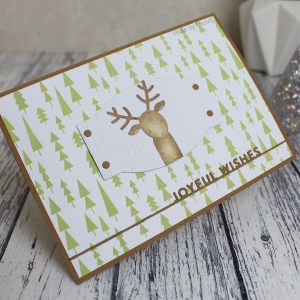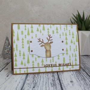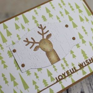 I used a background stamp and sentiment die from Simon Says Stamp together with a cute deer from Poppystamps’ ‘Whittle’ series. Isn’t he cute?