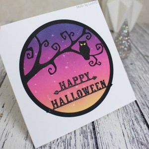 Once I was happy with my background, I spritzed/blotted some water droplets and then adhered my favourite Halloween purchase from last year – the Sizzix moonlit owl die – which I managed to pick up when my local craft shop was having a sale!