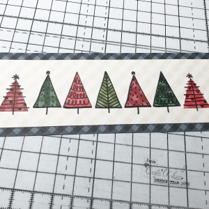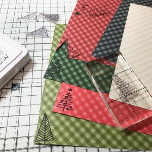 I decided to use four of the tree images that are roughly the same shape for my card – much easier to fussy cut a simple triangle! I stamped the images a few times on the red and green papers and cut them out, making sure I cut into the black outline.