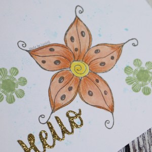 I decided to move away from hearts and instead used a beautiful wood-mounted flower stamp from Magenta as my focal point, which I coloured for my Day 16 Colouring for the Daily Marker 30 Day Challenge. I played around with different ideas (leaves, smaller flowers) for the other two images until I came across my fun Hero Arts Quattros set – I liked the contrast between the images and decided on a stamp from that set instead!