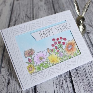 I inked up the gorgeous Mama Elephant Wild Meadow stamp, which were so much fun to colour! I blended some distress ink to create the sky and then added a generous spritz of watered-down Pixie Dust. Hope you can see that gorgeous shimmer! To finish off the card, I added a sentiment from Simon Says Stamp. I bought the set on clearance and whilst I rarely use the images in the set, that sentiment gets a LOT of use at this time of year. There aren’t that many spring sentiments out there!