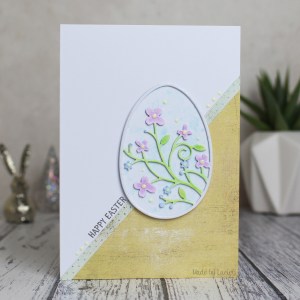 I chose an ‘oldie but goodie’ Memory Box die that I have had for many years – the pretty Waltham Egg and coloured it with my Zig brushmarkers before adding some highlights with my Prismacolor pencils. I then added a generous coat of Pixie Dust, which hopefully you can see a bit of in the second photo!