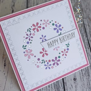 Here’s the card I made for her this time – I used the Simon Says Stamp Floral Sparkle Wreath that I picked up when it appeared one their deals and steals page a few weeks ago.