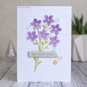 I adhered the die cut to a base that I’d embossed with a Spellbinders folder and added a Memory Box stamped sentiment.