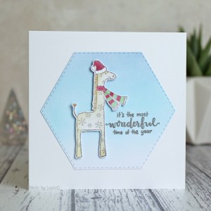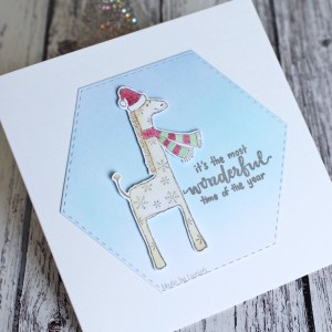 For today’s card, I used the sweet Hero Arts Holiday Giraffe stamp from 2007 which I fussy cut and adhered to a base of blended Tumbled Glass/Stormy Sky distress ink. The sentiment is by Winnie & Walter.