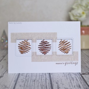 Anyway, I chose to flip the sketch from this week’s Freshly Made Sketches challenge to make a landscape card. I used a window die from My Favorite Things together with an ornament die from Simply Graphic. The front of the card is adhered by foam tape and I was originally planning to just attach the ornaments to the top of each window but they ended up looking really weird, so they are all adhered to the base using the tiniest slivers of foam tape!