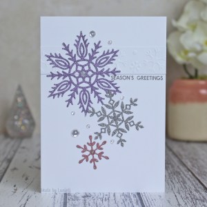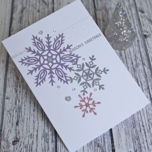 Today, I’m playing along with the sketch challenge at Try Stampin on Tuesday. I embossed a strip of white card using a Crafts-Too embossing die and adhered it to my card base before stamping a sentiment from The Ton. I then used snowflake dies from Simon Says Stamp and My Favorite Things to create some glittery snowflakes which I adhered following the sketch.