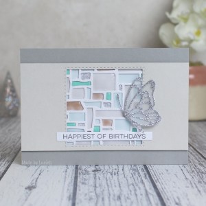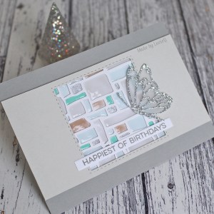 I love this week’s 400th sketch…. so many possibilities! In the end, I decided to create a square focal point using the Penny Black Wonky Squares background die which I filled with lots of Nuvo drops. I added the Memory Box Flitter Side Butterfly die and a sentiment from My Favorite Things to complete my take on the sketch.