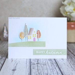 I didn’t do too much inlaid die cutting this time – just the cottage. For the trees, I coloured some card using my Daniel Smith Watercolours and then stuck my die cut on top before adhering the image to the card base.