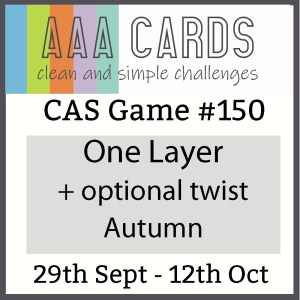 I can barely believe that it’s time for a new challenge at AAA Cards! The weeks seem to fly by, don’t they? This fortnight we’d like you to create a one-layer CAS card and the optional twist is autumn. Our sponsor is Winnie & Walter.