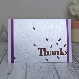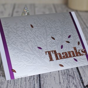 I’ve been itching to play with the faux metal etching technique that Jennifer McGuire demonstrated a few weeks ago and today was the day! I used some silver matte mirror card and the Simon Says Stamp Brushed Branches background stamp. What a fun technique – but so very difficult to get a decent photo.