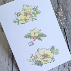 I decided to use the beautiful Mama Elephant Pine and Posy set again. I coloured the images with my Twinkling H2Os and then die cut them with the coordinating dies. I lightly splattered gold paint across the background before adhering the images and stamping a Mama Elephant sentiment to complete my card.