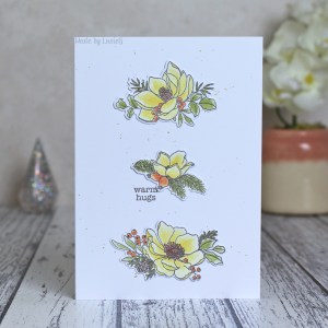 I decided to use the beautiful Mama Elephant Pine and Posy set again. I coloured the images with my Twinkling H2Os and then die cut them with the coordinating dies. I lightly splattered gold paint across the background before adhering the images and stamping a Mama Elephant sentiment to complete my card.