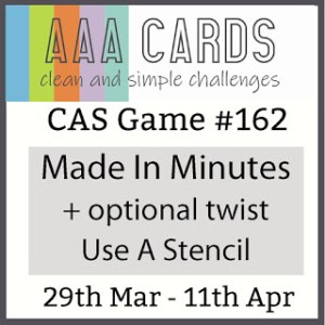 It’s time for another challenge at AAA Cards! This fortnight we’d like you to create a CAS card in ‘minutes’. Our optional twist this time is ‘use a stencil’. Funky Fossil is our sponsor.
