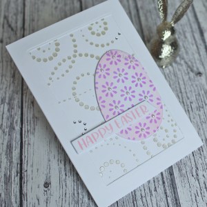 Lots of stencilling today – I created the egg using an Echo Park Paper Company stencil and a Memory Box egg die. Then, I used some embellishment mousse with a Colorbox stencil to create the textured background. The sentiment is by Simon Says Stamp.