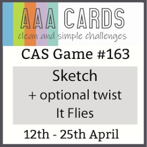 It’s time for another challenge at AAA Cards! This fortnight we’d like you to create a CAS card using our sketch. Our optional twist this time is ‘it flies’. Stamplorations is our sponsor.