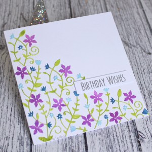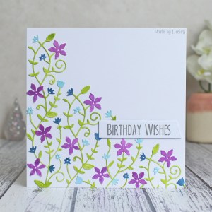 I’m currently challenging myself to use some of my older, little used dies. I always struggle a bit with border dies – I have MANY pretty ones, but I get stuck trying to incorporate them into different card designs. This card is actually made from the pretty Memory Box Fairytale Flower Border die that I cut and coloured three times and then cut up and arranged to cover half of my card base. The sentiment is by Your Next Stamp.