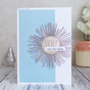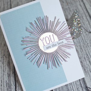 I cut a couple of pieces of matt mirror cardstock using the Simon Says Stamp Burst die and stuck the two die cuts together. I adhered a piece of patterned paper to my card base and added the starburst die cut. Finally I added the sentiment – the stamp is from a set by Simon Says Stamp and the letter dies are from My Favorite Things.