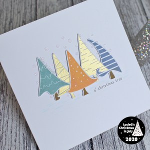 I used a stencil to add some glittery snow to my card base and adhered the trees using foam tape.