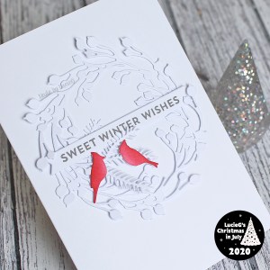 Oh my gosh! White on white cards are always so beautiful but your addition of the bright red cardinals is amazing! Thanks for joining us at Freshly Made Sketches!