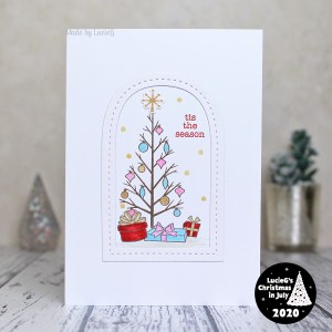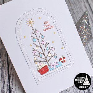 I knew I had to use the fabulous My Monthly Hero kit from October 2019 once again and finally inked up my favourite stamp from the set – isn’t that tree fabulous? I coloured it with my Twinkling H2Os and added a Reverse Confetti frame die, reflecting the window in the inspiration photo.