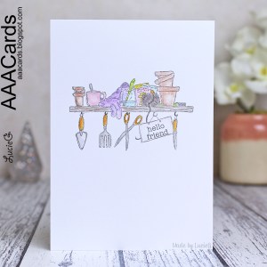 Anyway, on to my card for this challenge! For AAA, one layer means just the card base, no additional die cuts unless it is inlaid into the card base. A one-layer challenge is mainly a stamping or stencilling challenge for me really. I’ve actually used clear stamp sets for a couple of gardening cards whilst I’ve been blogging (here and here), so I turned to my old wood-mounted rubber stamp collection this week! I used an old Funstamps stamp called Gardening Shelf which I felt was a good reflection of my yard work type of gardening!! I coloured the image with my Twinkling H2O paints… and yes, I do have purple gloves for gardening!! The sentiment is by Mama Elephant.
