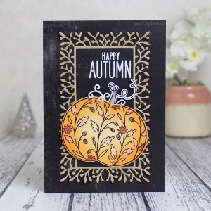 I chose a piece of distressed black paper as my base and adhered the Simon Says Stamp Woodland Rectangular Frame which I had cut twice to extend (the join is hidden by the pumpkin). I heat embossed the Hero Arts sentiment and then adhered the pumpkin and some die cut swirls to complete my card.