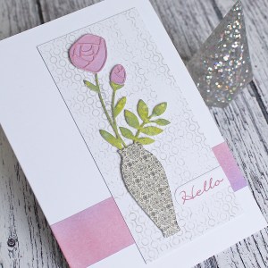 I used one of my favourite MFT background stamps (Lined Up Dots) which I covered lightly and unevenly with Pumice Stone distress oxide ink to give it that distressed effect. I used the Flower Vase die with some Basic Grey patterned paper and cut the Roses in Bloom dies from some distress ink panels. I adhered a coordinating strip to my card base first and then added all the elements. Finally I added a sentiment from the ANCIENT GP Wildflowers set!