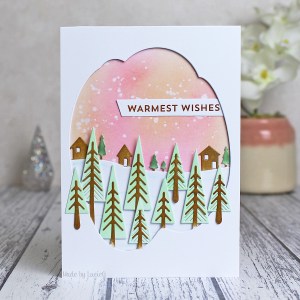 For today’s card, I used my brand new Pine Tree collage die which I thought I could resist, but when I found it during a Black Friday sale last month, it just leapt into my basket! I also added the older Country Landscape die. The die is actually much wider than my card, but I cut it up so that I could get all the cabins in my scene. The join in the cardstock is hidden by a tall tree!