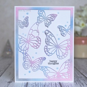 I created a blended panel using Stormy Sky, Spun Sugar and Hickory smoke distress ink and then cut it using the Memory Box drifting butterflies background die.