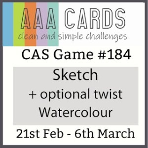 It’s time for another challenge at AAA Cards! This fortnight we’d like you to create a CAS card using the sketch below and if you want to join with our optional twist, please use watercolour in some way!