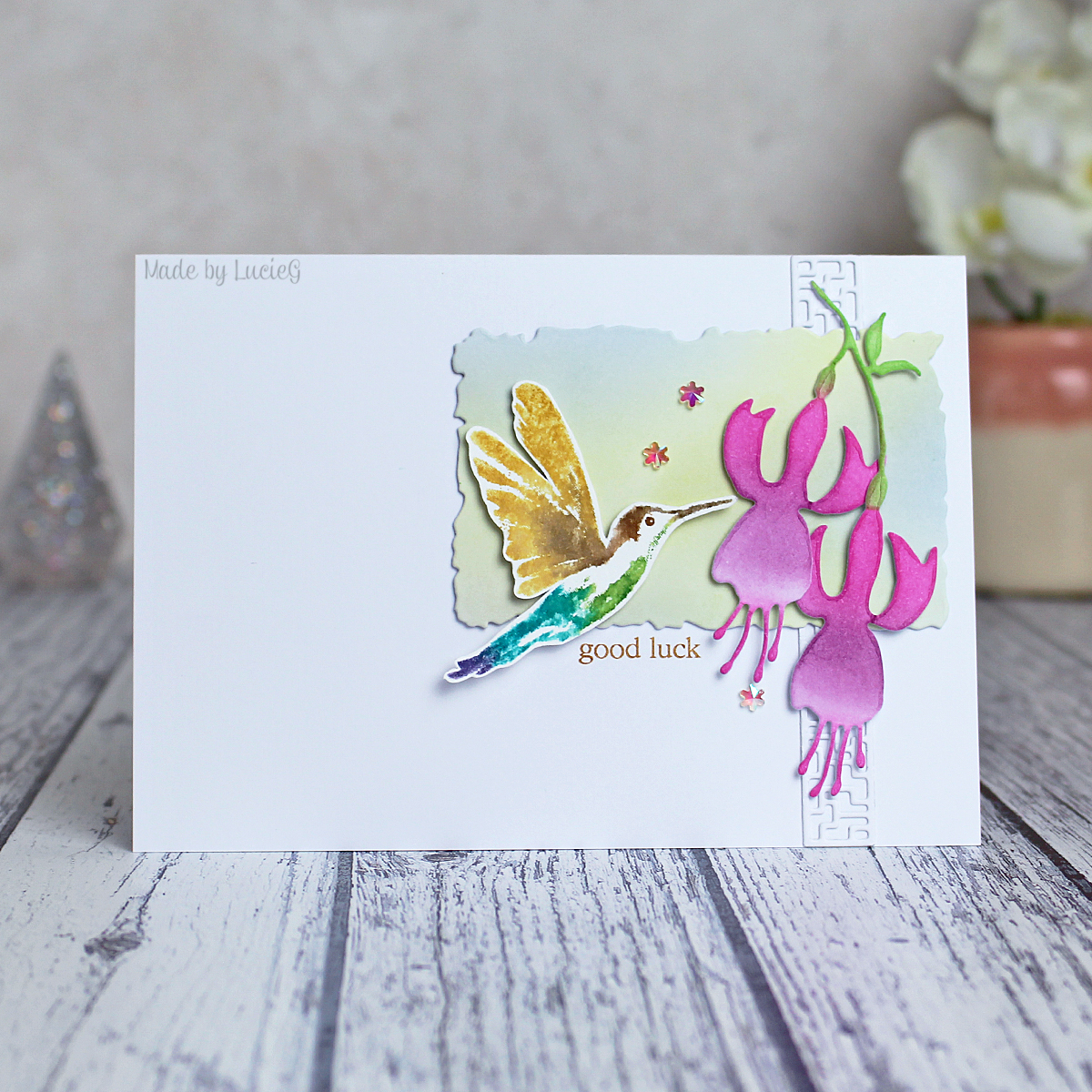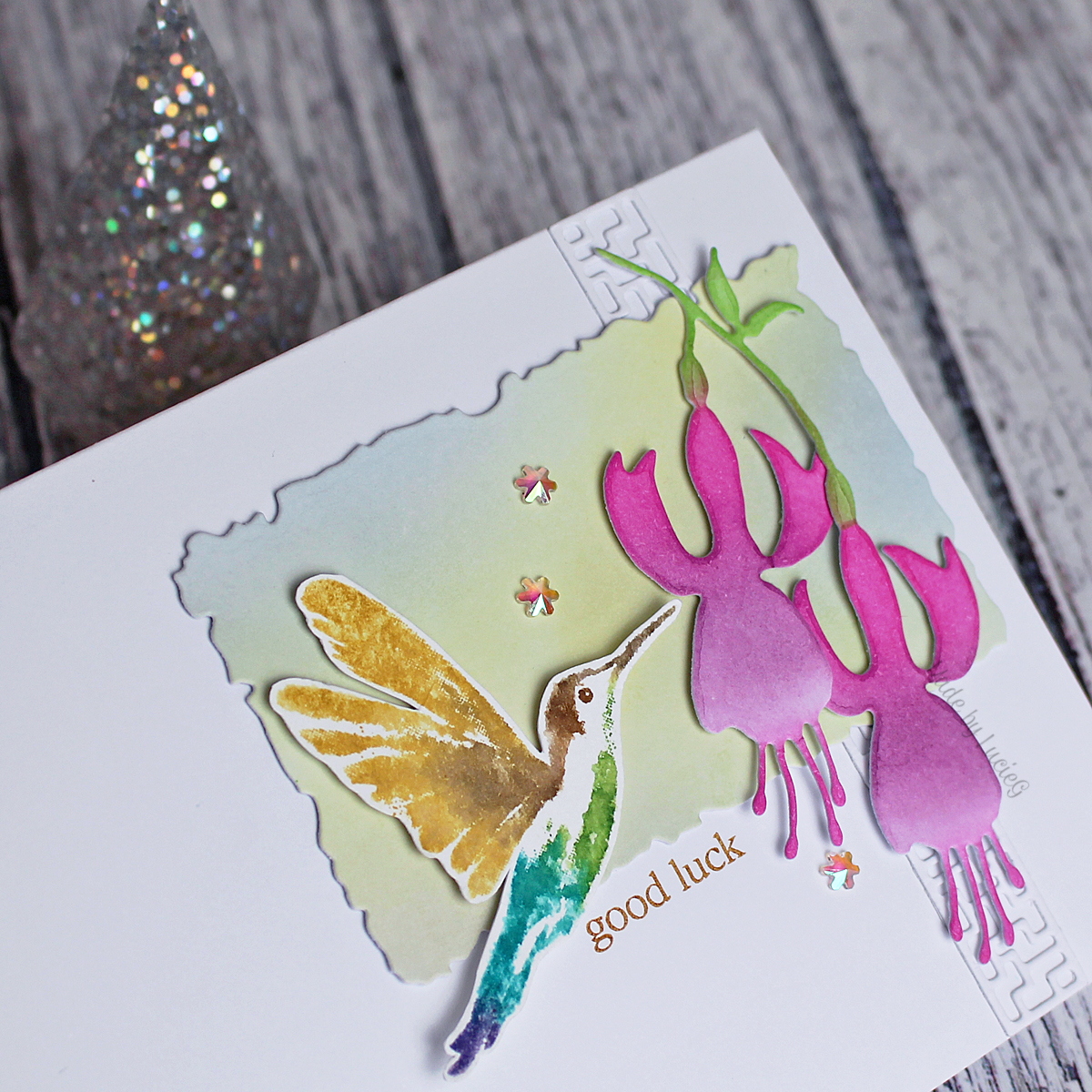 I knew I wanted to use the wonderful fuchsia die (51-045) as well as the gorgeous hummingbird stamp from the Flying Colors set (40-739) set.