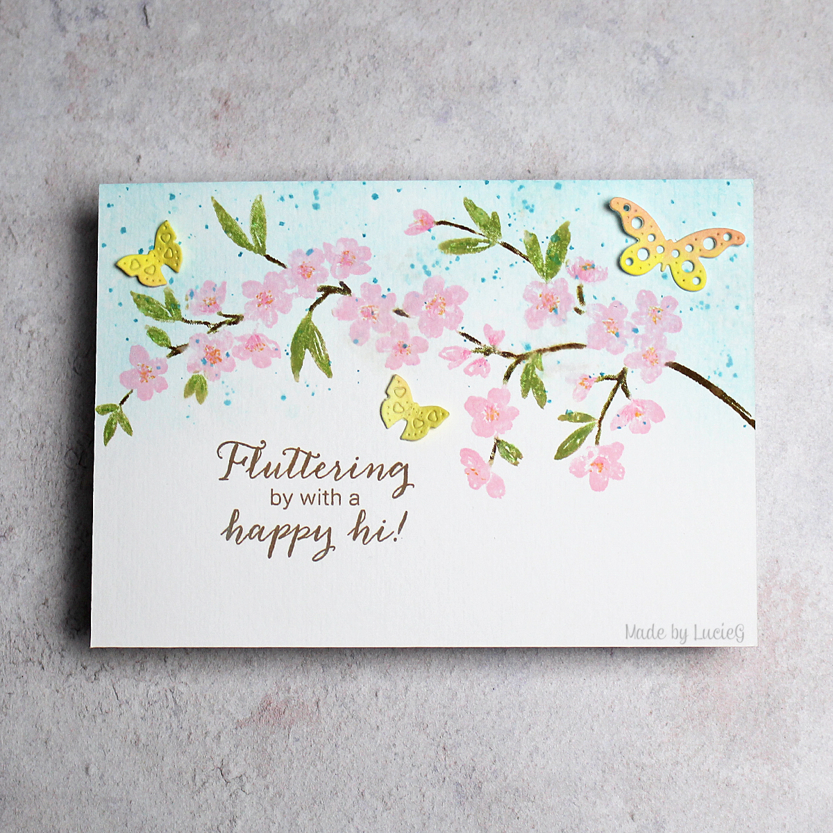 After a snowy start to the week, it’s starting to look more springlike here now, although it’s still pretty chilly. Sadly the magnolia blooms have a lot of frost damage, but we’ve got a few cherry blossoms, so I decided to use them, along with the Time Out challenge photo, as my inspiration today.