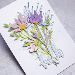The theme of the Memory Box / Outside the Box challenge is ‘paint’ which had me stumped for a while because I was thinking of distress and acrylic paints. Then I realised the theme would also cover watercolour paints as well! So I pulled out all my recent Memory Box stem (Wildeflower Stems, Daisy Stems and Seed Stems) and got to work with my watercolours. I smooshed and splattered some Speckled Egg and Frayed Burlap distress oxide ink on my card base and then adhered the stems. I added the Memory Box Jotted Script Hello die to finish it off.