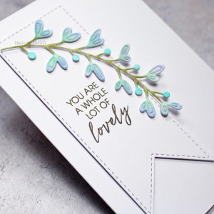 As you can see, I kept this super simple and super CAS! I used a die from my new Sugar Pea Designs Botanical Branches die set – I had been stalking the Seven Hills Crafts website waiting for them to get this in and I was so pleased to get my hands on it! I blended some regular distress ink over the die cut image and decided to leave the centres of the leave in situ. I then cut the long fishtail tag using a Simon Says Stamp die, stamped an Essentials by Ellen sentiment and adhered the botanical branch before adhering it to my card base.