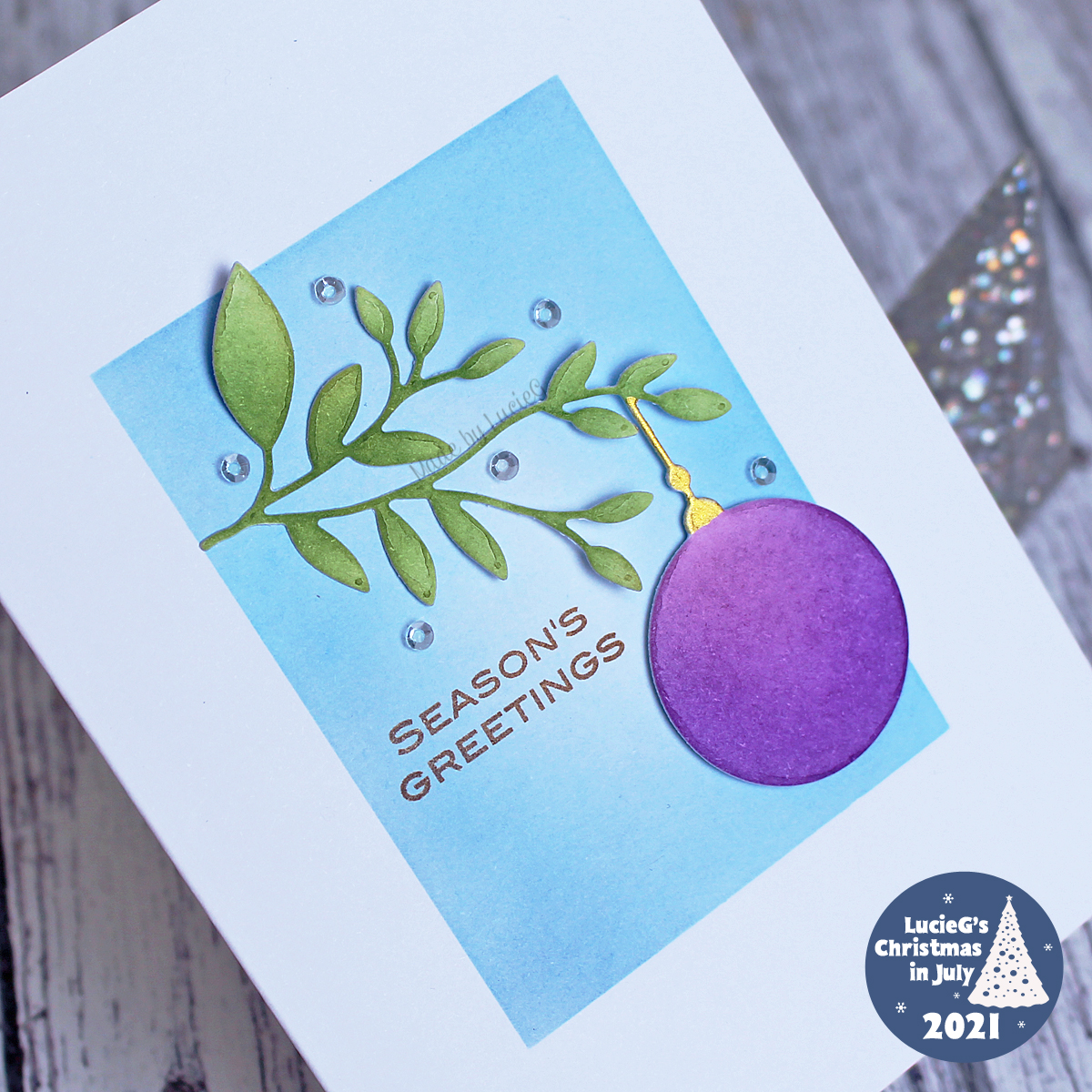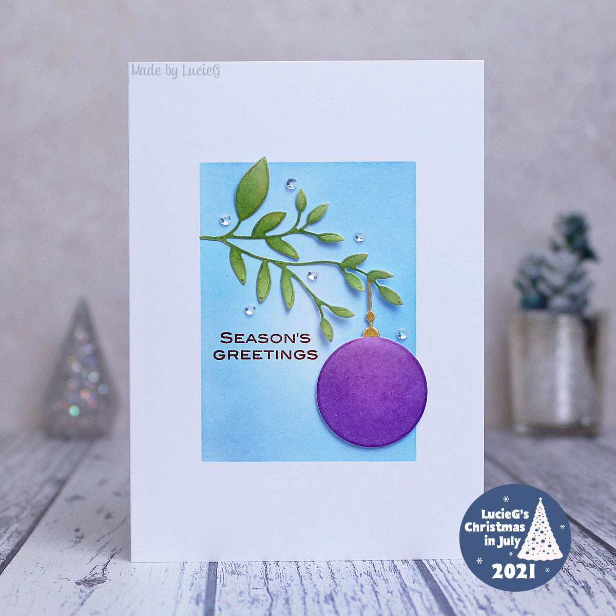 So, for Christmas in July Day 1, I’m playing along with the Color Throwdown challenge which has a beautiful combo (purple, blue and green). It made me smile when I saw the combo because I remember using a very similar combo during LucieG’s Christmas in July 2020! Anyway, to start with, I masked a rectangle and blended some blue distress ink on my card base. Next, I pulled out Penny Black’s ornament branch (51-481) which I coloured with distress inks. Finally I added a sentiment from the Penny Black Beauty of The Season stamp set (30-254) and a few sequins to complete my card.
